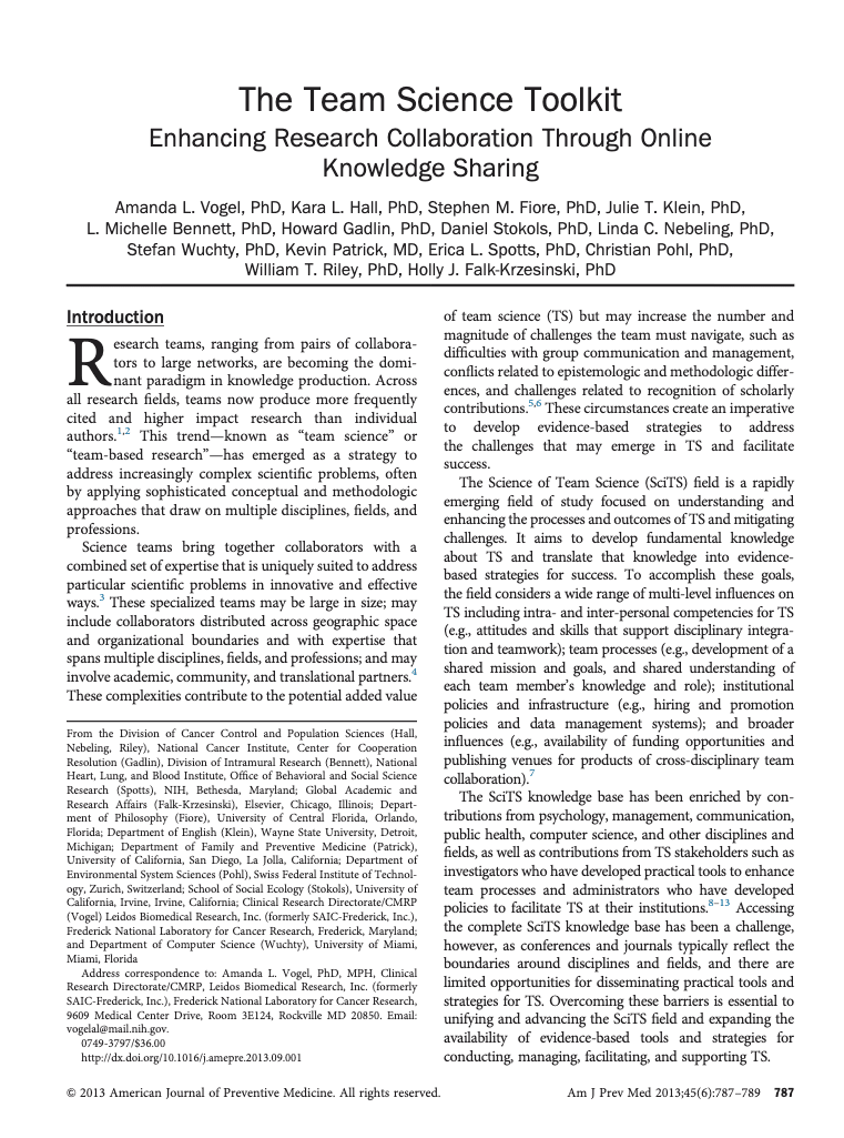 Vogel, A L, Hall, K L, Fiore, S M, Klein, J T, Michelle Bennett, L, Gadlin, H, Stokols, D, Nebeling, L C, Wuchty, S, Patrick, K, Spotts, E L, Pohl, C, Riley, W T & Falk-Krzesinski, H J (2013)